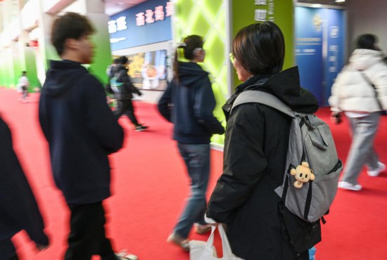 11月29日,一名观展者将挂链款的“链氪”毛绒玩具挂在自己的背包上。