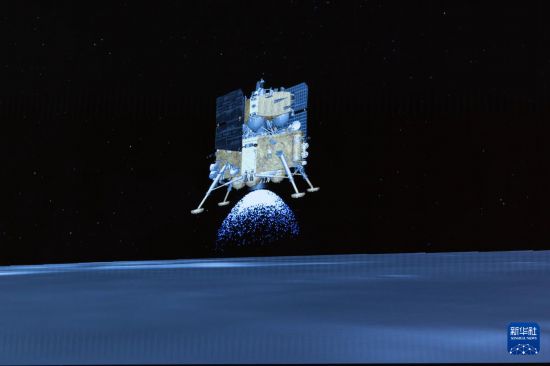 这是6月2日在北京航天飞行控制中心屏幕上拍摄的嫦娥六号着陆器和上升器组合体着陆月背的模拟动画画面。新华社记者金立旺摄